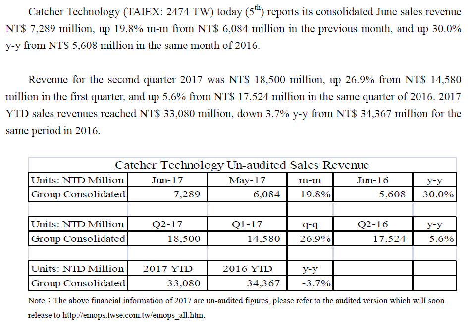 Catcher Technology reports consolidated June sales