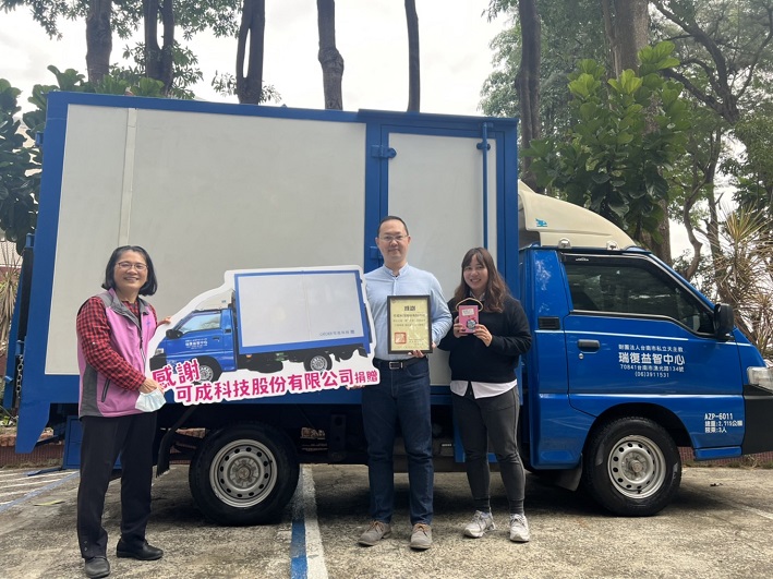 年車齡的貨車老舊,已不堪使用,特別捐贈一台發財車予瑞復益智中心,來運載餐食等用途及乘載大小朋友的希望。